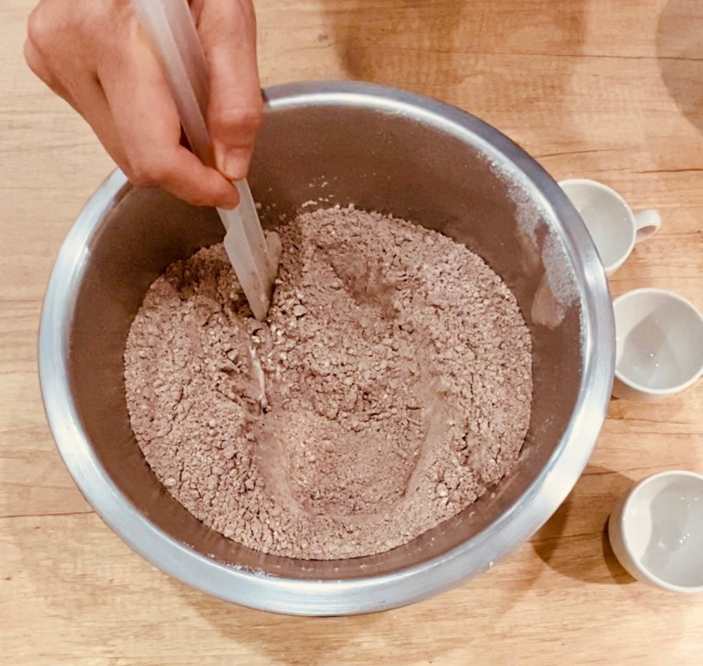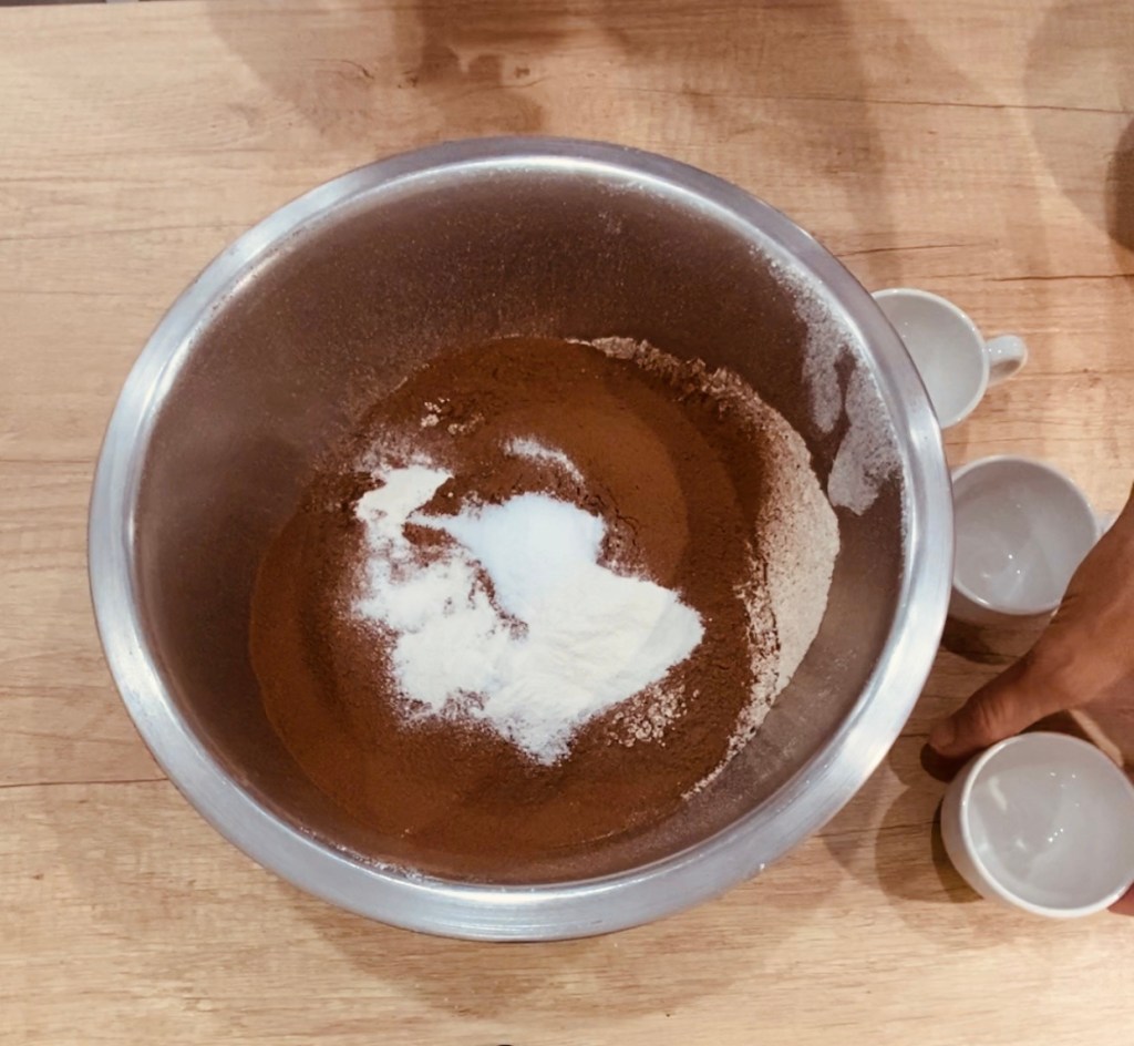 1. Sift both the flour and cocoa powder, then add all the dry ingredients. Mix well.