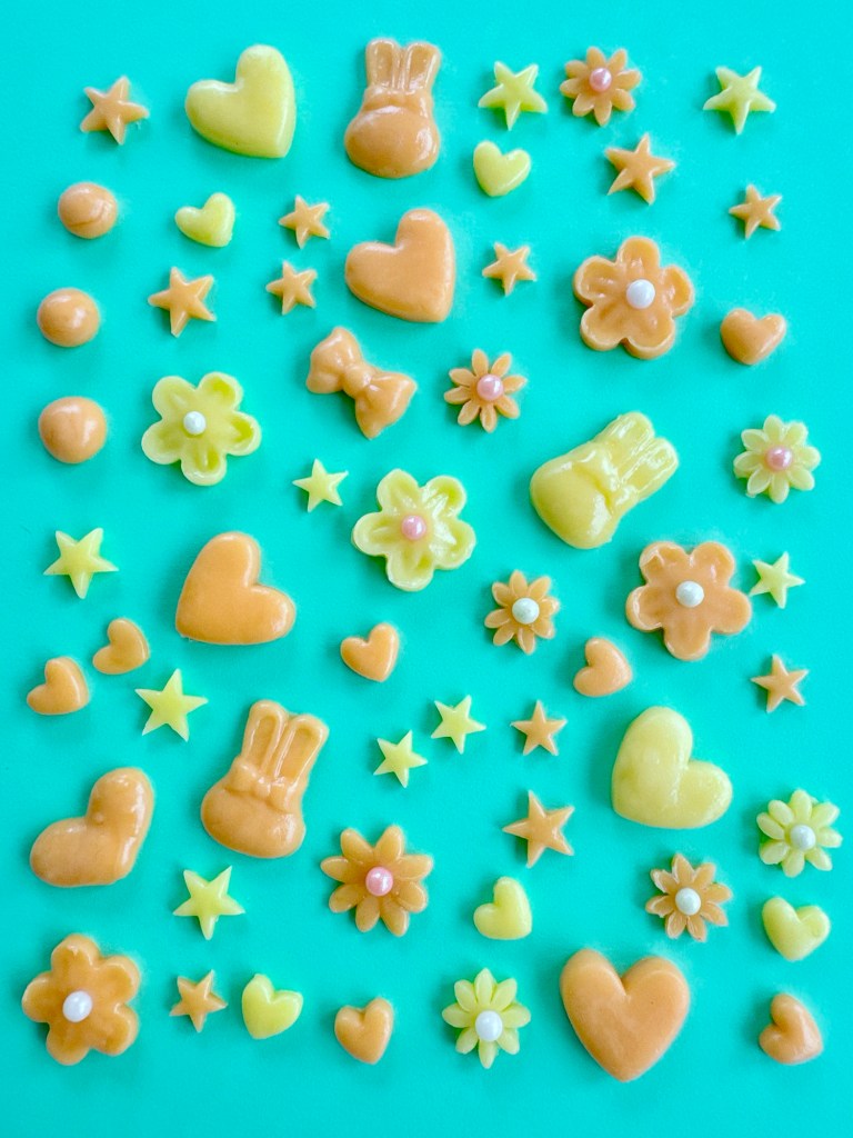 This time, I replaced fondant paste with these delicious tropical candies. It’s harder to roll out, but the new taste is worth it. It only works for small pieces because it’s not soft enough. I chose mango, pineapple, and lemon flavors. You can decorate cakes, cupcakes, cake pops, or lollipops or just having fun with your children.
